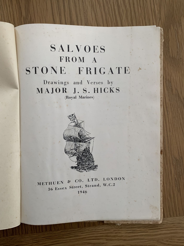 Salvoes from a Stone Frigate: A Book of Illustrated War Verses is a rare book written by Major J. S. Hicks and published shortly after World War II. The book includes poetry, war history, and drawings.