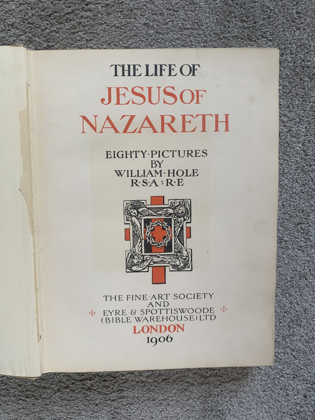 Dating from 1906 this heavy hardback book tells the life of Jesus of Nazareth and includes 80 beautiful drawn images by William Hole. It is number 257 of a limited edition run of 1000 books and is signed by William Hole