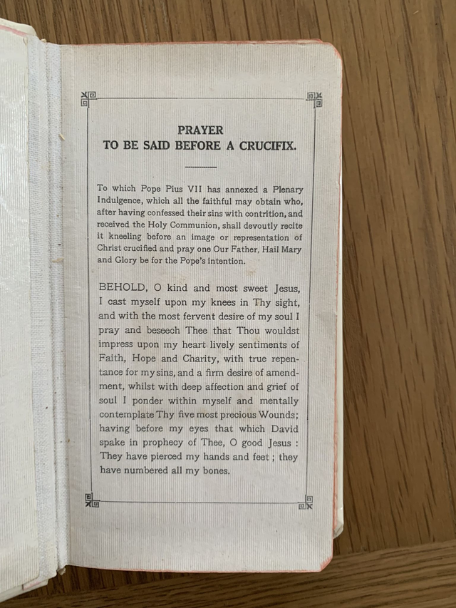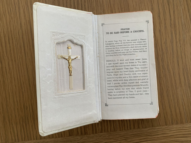 Beautful cream coloured cover, edging is gold leaf, with crucifix inside the cover