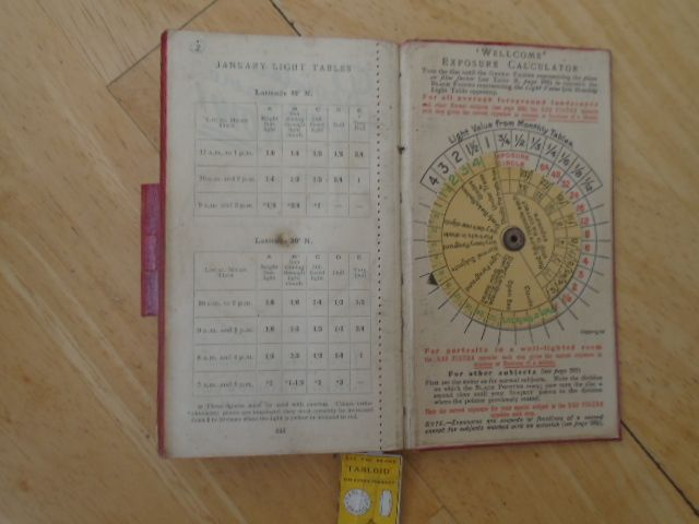 Dating from 1923 this pocket handbook gives details regarding photography and includes a exposure calculator wheel inside the back cover (See last photo)